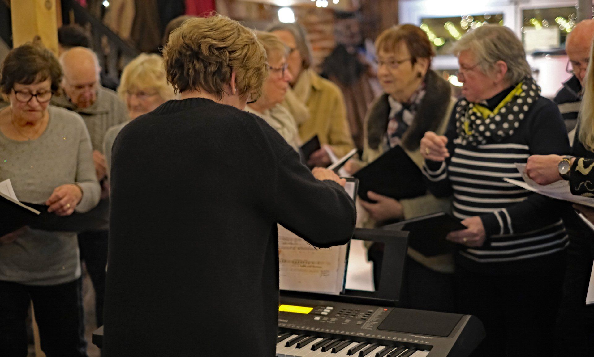 Der gemischte Chor sang im Anschluss vier Lieder. Nachdem zeigte Carmen Gäth eine 25 Minütige Diashow über die Geschehnisse des Jahres 2023. Da wurden einige Erinnerungen wach. Man tauschte sich aus. Frau Pop stimmte mit ihrem elektronischen Klavier einige bekannte Weihnachtslieder an, sodass alle Anwesenden kräftig mitsingen konnten. Ursula Mlyniec und Heidi Schrötter erzählten sehr schöne Weihnachtsgeschichten. Catriona Valenta und Sylvia Schnöbel sangen spontan teilweise auf englisch in Begleitung von Frau Pop einige Weihnachtslieder vor.