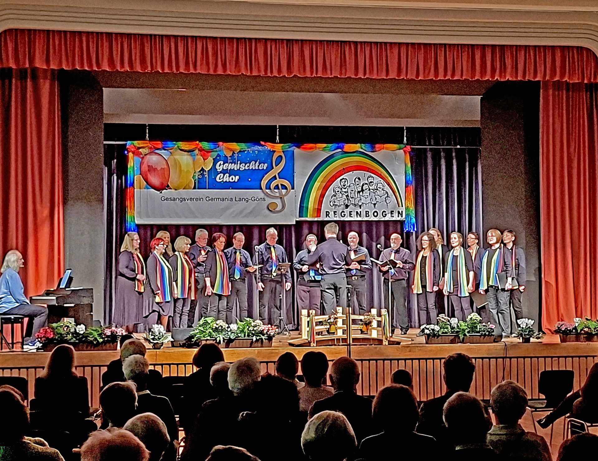Vom kleinen Saal ausgehend sang der Chor Regenbogen aus Londorf. Über sieben Brücken musst Du gehen bis auf die Bühne im Bürgerhaus. Jeder der Sängerinnen und Sänger ging über eine kleine Brücke auf der Bühne. Carmen Gäth vom GV Germania Langgöns trat auf diese Brücke und erklärte, dass die Theatergruppe des GV Germania Langgöns e.V. „normalerweise“ an diesem Wochenende Theaterspielen wollte. Sie ist sich sicher, dass nächstes Jahr wieder Theater gespielt wird. Man überlegte was tun. Also wenn das Theater schweigt, darf die Musik klingen erklärte sie dem Publikum. Deshalb lud man sich für heute Abend den Chor Regenbogen aus Londorf ein. Der mit seinem Können, seiner Energie und seinen wunderbaren Stimmen ein berührendes Konzert darbieten wird. Arndt Roswag der die Leitung des Konzertes und des Chores hat, bedankte sich für die zahlreichen Zuhörer. Erklärte, dass er nicht alles alleine dirigieren kann, deswegen werden Martina Kosljar und Thorsten Kunz einige Liedbeiträge dirigieren. Anschließend übergab er das Mikrofon an Martin Gärtner, der durch das Programm führte und den Chor mit dem Klavier begleitete.